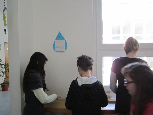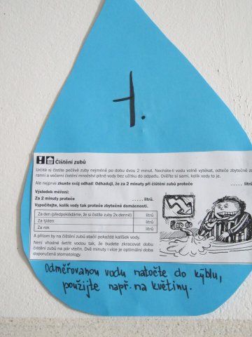 Nejdříve si třídy musely zadání úkolů najít v budově školy, naštěstí nápovědou byly vodní kapky. Zjišťovali jsme, odkud se bere voda v našich kohoutcích, připomněli si koloběh vody v přírodě, měřili jsme, kolik vody nám uteče za minutu, pokud necháme puštěný kohoutek. A taky kolik ušetříme, když budeme zavírat vodu při čistění zubů nebo pokud vyměníme vanu za sprchu. Prakticky jsme si ověřili základní vlastnosti vody formou pokusů.