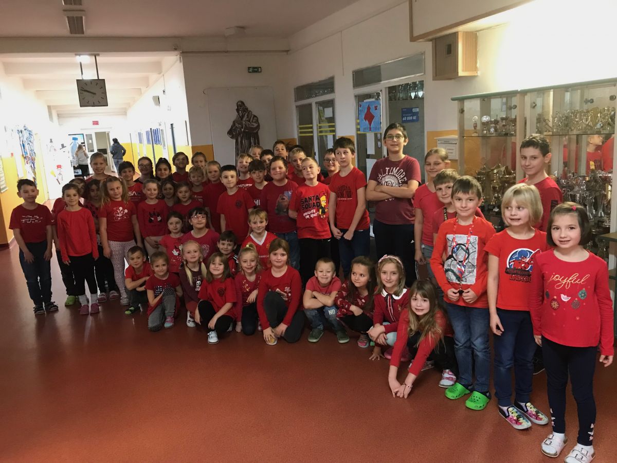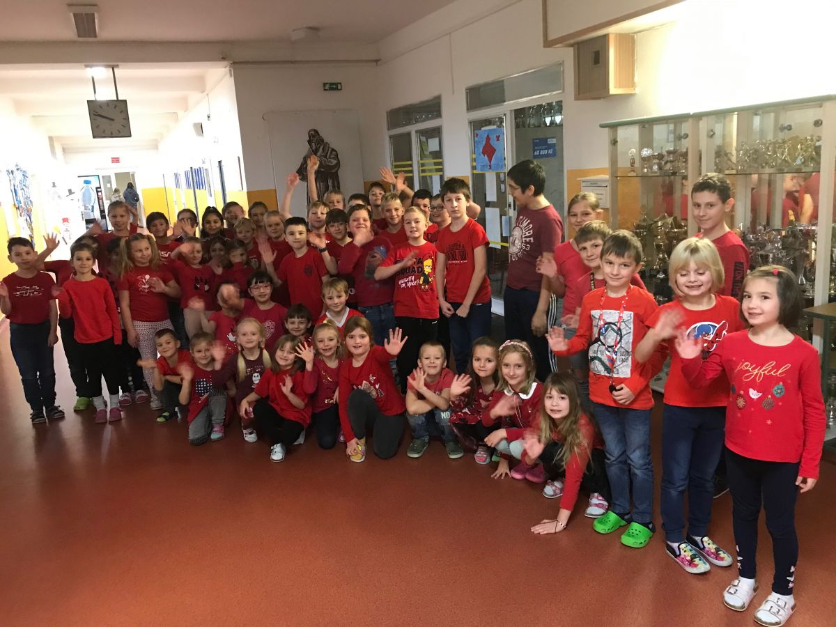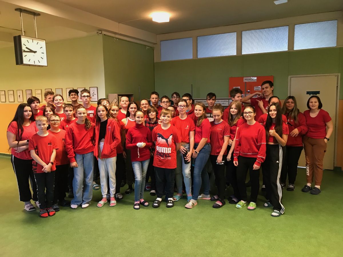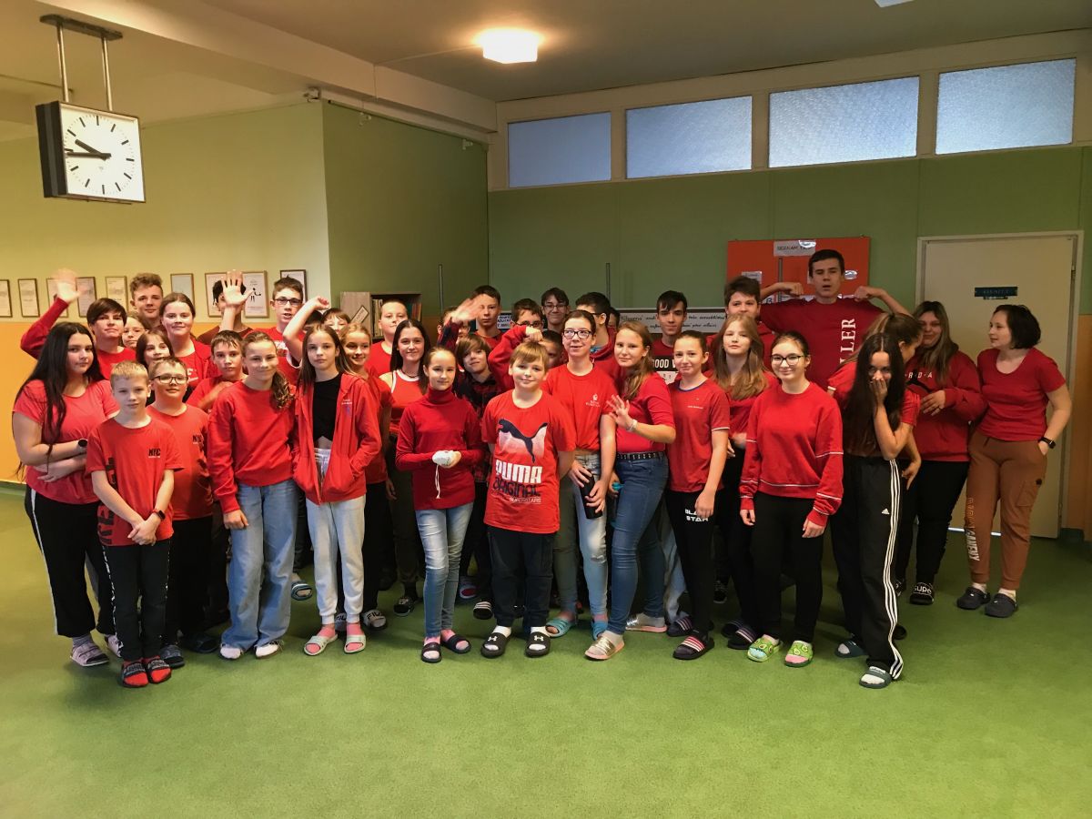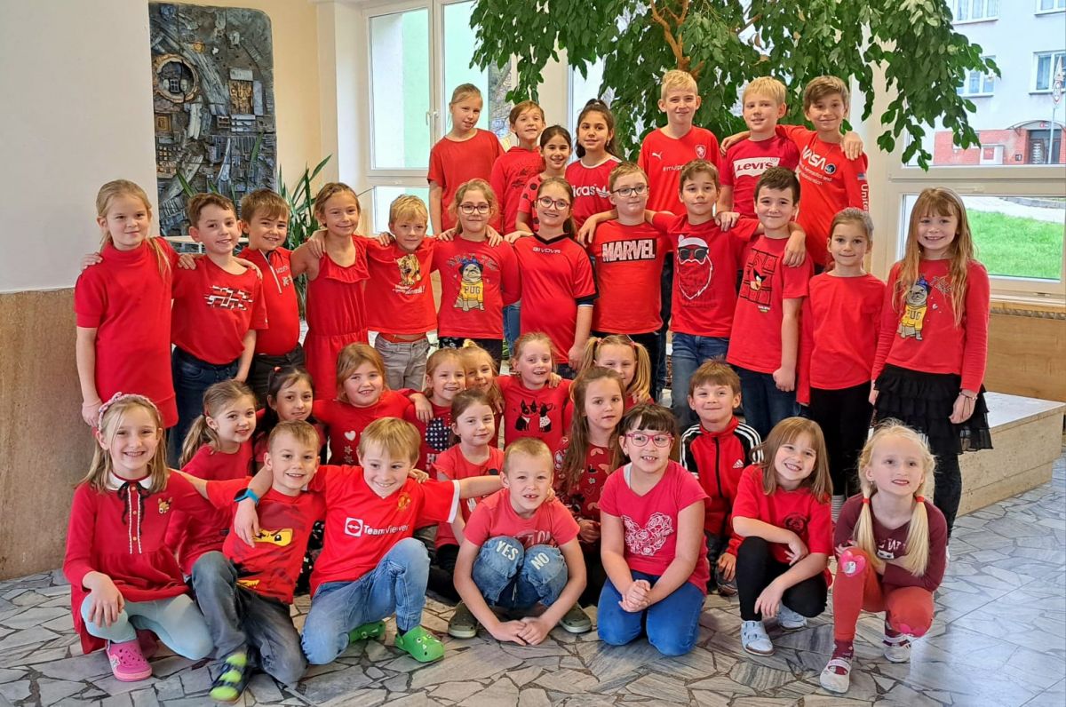 Ve středu proběhl na budově Boženy Němcové Den v červeném tričku.