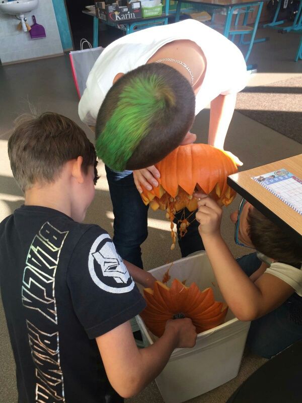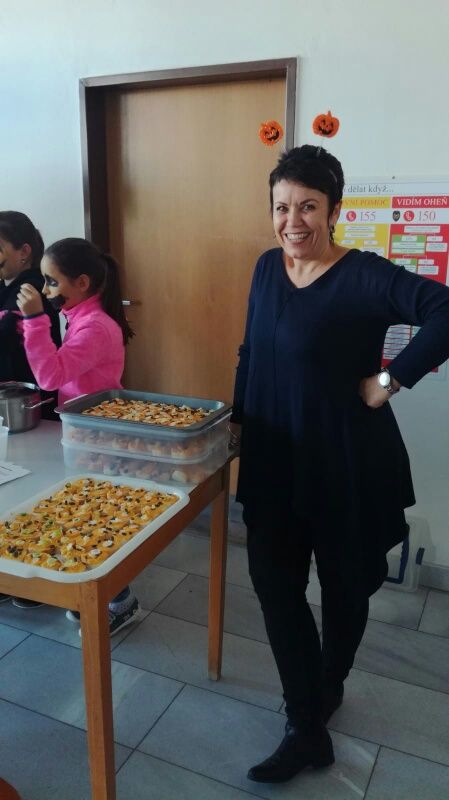 Dopoledne jsme dlabali a zdobili dýně a hlavně z dýní vařili. Každá třída si našla a vybrala jeden dýňový recept, který potom ostatním představila.